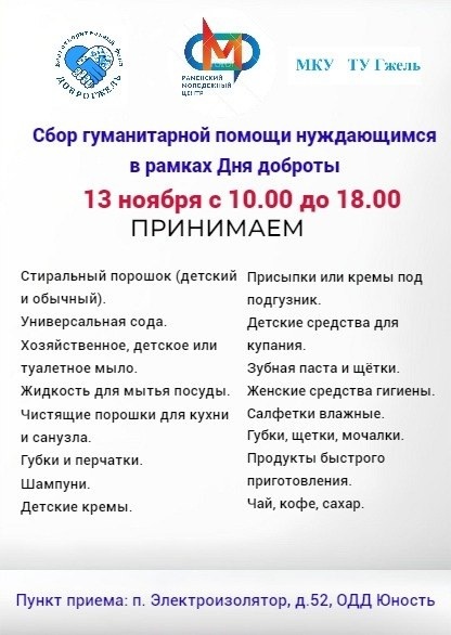 Раменский молодежный центр, МКУ "ТУ ГЖЕЛЬ" и Гжельский благотворительный фонд "Доброгжель" приглашают вас принять участие в сборе гуманитарной помощи нуждающимся!